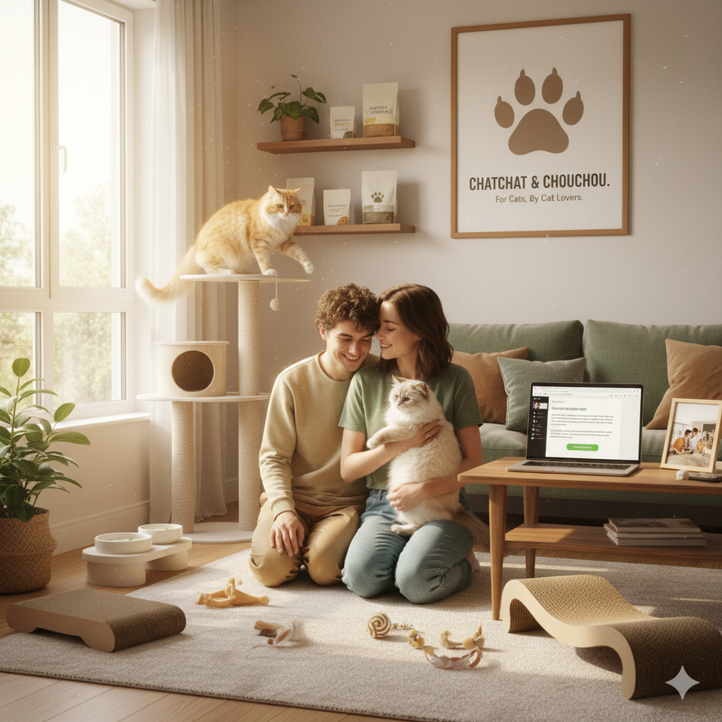 Nous sommes un couple uni par la même passion : offrir aux chats une vie plus saine, plus simple et plus heureuse. En accueillant Chatchat puis Chouchou, nous avons découvert à quel point les accessoires “jolis” ne sont pas toujours utiles, et combien il est difficile de trouver des produits vraiment fiables, sûrs et bien pensés.